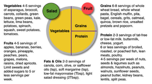 The Healthy Eating Plate template serves as a concise and functional guide for creating high quality meals. Based on the plate template, half of your plate is vegetables and fruit. You are encouraged to omit potatoes, but otherwise aim for color and variety. A quarter of your plate should be whole and intact grains to include whole wheat, barley, wheat berries, quinoa, oats, brown rice, and foods made with them such as whole wheat pasta. A quarter of your plate should be protein to include fish, chicken, beans, and nuts and foods made with them such as salads. Limit red meat, and avoid processed meats such as bacon and sausage. Healthy plant oils can be used in moderation. Consider olive, canola, soy, corn, sunflower, peanut, and other oils, but avoid partially hydrogenated oils containing trans fats. Drink water, coffee, or tea. Omit sugary drinks and limit juice to one small glass per day and milk and dairy products to one to two servings per day. Finally, you are encouraged to be active for health and weight control.68
